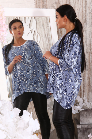 Туника А - образного силуэта выполнена из 100% хлопчатобумажного трикотажного набивного полотна. Горловина и рукав обработаны белым кантом. Данная модель, скрывающая недостатки и подчёркивающая достоинства фигуры, для удобства дополнена боковыми карманами.