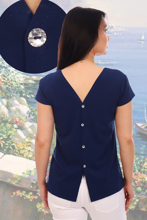 Футболка молодёжная с мерцающим принтом на груди, из эластичного, высококачественного, приятного к телу трикотажа. Горловина круглая, короткий рукав, слегка расклешенная к низу. Имитация распашной спинки украшена декоративными пуговицами, что придаёт футболке некую изюминку. Модель интересная, универсальная, её можно носить с брюками или джинсами, а также с юбкой. Подойдёт как для работы в офисе, так и для повседневного гардероба.