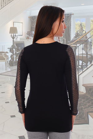 Модель полуприлегающего силуэта, длиной до линии бедер. Перед с кружевной кокеткой и планкой, визуально удлиняющей фигуру. Рукав длинный с широкой полосой из кружева. Блузка изготовлена в чёрной расцветке с отделкой из кружева с люрексом в горошек, а в васильковой расцветке кружево с изящными цветами.
