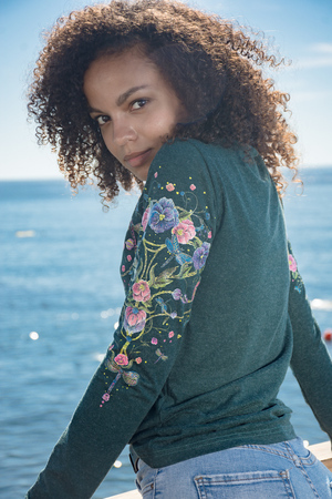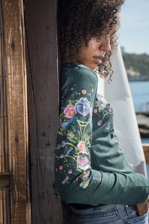 Универсальная модель из очень мягкой, комфортной к телу ткани. Прекрасно комбинируется с лосинами, джинсами, юбками, брюками. Полочка и рукава оформлены красивым цветочным принтом со стрекозами с добавлением золотого глиттера. Ткань очень хорошо тянется.