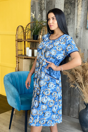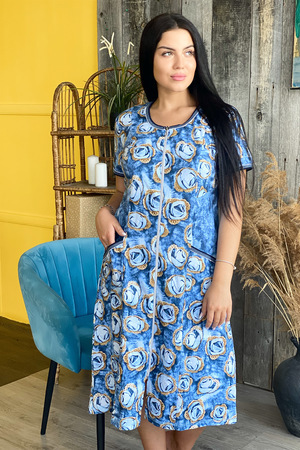 Халат женский полуприлегающего силуэта. Застежка - молния. Вырез круглый. Рукав втачной короткий на манжете. На полочке и спинке рельефы. Средние части полочки и спинки, манжеты рукава из отделочной однотонной ткани.