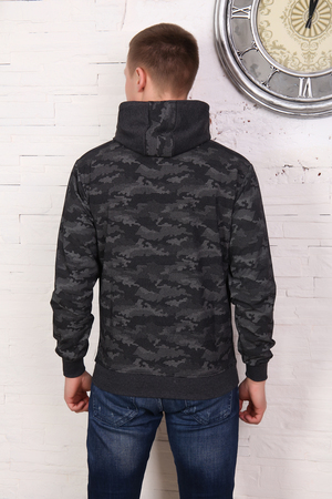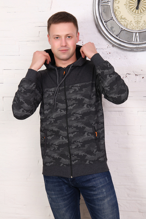 Мужская толстовка на молнии, с карманами на молнии, с капюшоном. Выполнена из двух тканей разной фактуры, низ и рукав на манжете, отделка кармана, двойной капюшон. Стильная толстовка, можно стилизовать как с джинсами, так и со спортивными брюками. Камуфляжная расцветка всегда актуальна.