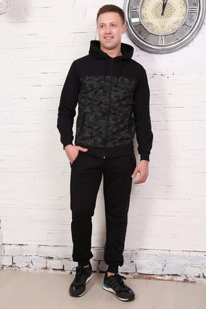 Костюм мужской состоит из толстовки с двойным капюшоном на молнии и брюк. Карманы на молнии, выполнен из двух фактурных тканей.