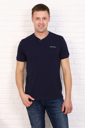 Мужская футболка с V-образным воротом. Рукава на манжетах, задняя полочка чуть длиннее передней. Слева на груди принт в виде надписи.