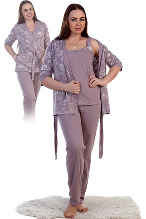 Пижамный костюм из кулирки халат + майка + брюки. Короткий запашной халат с поясом, дизайн в виде цветов. Однотонная майка на узких лямках, цветочные вставки. Однотонные брюки, длина до щиколоток