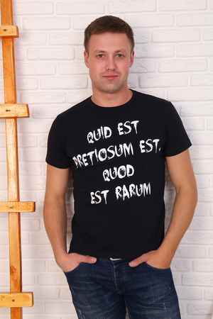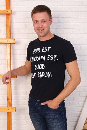 Футболка мужская с коротким рукавом и круглым воротом, плечевой шов усиленный. Изделие выполнено из плотной высококачественной кулирки с лайкрой качества пенье темно-синего цвета. Модная, приятная к телу футболка с современным принтом подойдет на любой случай.