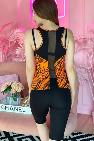 Майка-борцовка прилегающего силуэта, средней длины, с округлой горловиной. Вдоль спинки расположена вставка из сетки. Горловина и проймы майки обработаны бейкой из основного полотна.