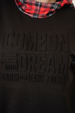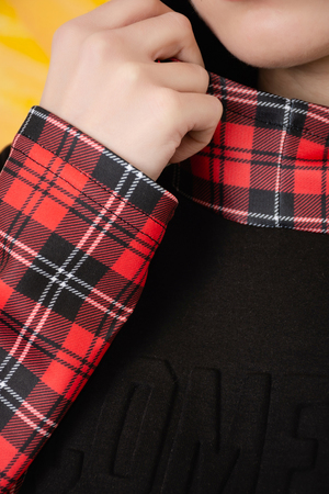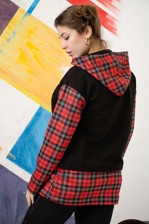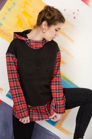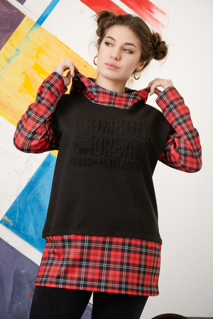 Стильная толстовка свободного силуэта. Рукава, капюшон и нижняя часть выполнены из ткани пике с принтом в клетку, основная ткань футер 2- нитка. На полочке с помощью техники "Эмбоссинг" выполнена надпись. Отличный вариант на каждый день!