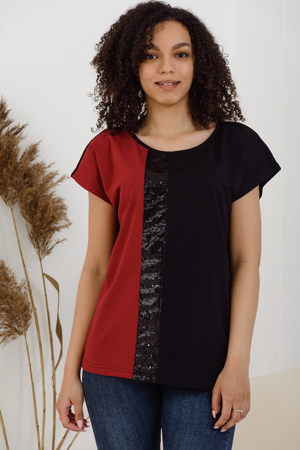 Комфортная свободного кроя футболка выполнена из легкого приятного к телу трикотажа. Короткий цельнокроенный рукав, округлая горловина и яркая тесьма с пайетками делают модель незаменимой и способной вписаться в любой стиль. Комбинирование цветов ткани на футболке позволяет создавать мягкие и контрастные сочетания в подборе гардероба.