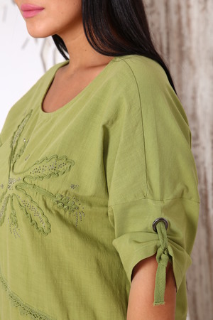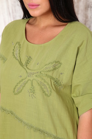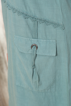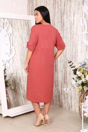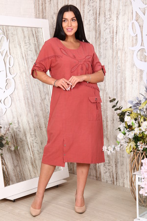 Льняное платье длины миди из качественной турецкой ткани. Украшено накладными карманами, специальным кружевом и вышивкой с аппликацией.