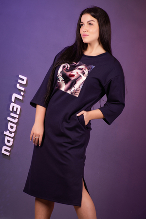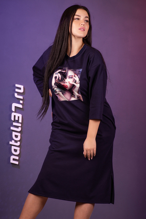 Платье из трикотажного полотна милано. Свободный крой, спущенное плечо, горловина обработана эластичным хлопковым кашкорсе, карманы в шве, по бокам разрезы. Изюминкой данного платья является большая пришивная аппликация, украшенная стразами и «жемчужинками». Платье отлично сочетается с различными аксессуарами и идеально подойдет на любой случай.