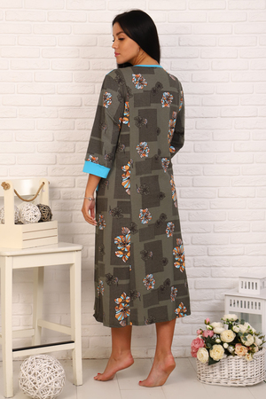 Халат женский на молнии свободного кроя. На полочках вставка из отделочной ткани. Также отделочной тканью обработаны манжеты рукавов и карманы. Длина рукава 3/4, длина халата ниже колен. Халат не стесняет движений и приятен к телу. Прекрасная модель для полноценных размеров.