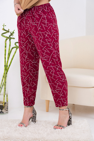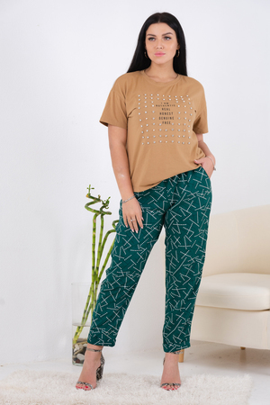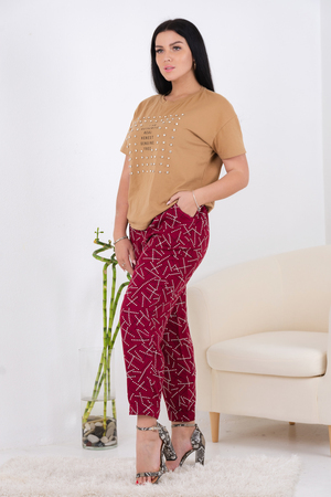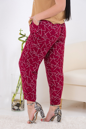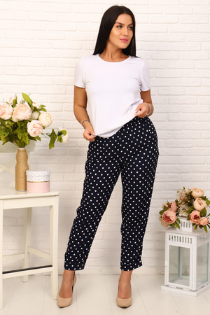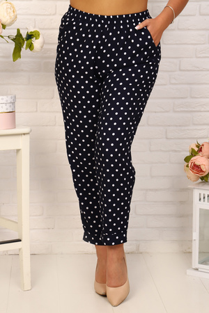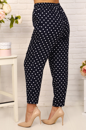 Брюки свободного покроя, зауженные к низу, длина 7/8. Пояс на резинке, на передних половинках внутренние карманы, На низках брюк притачные манжеты, подвернутые наверх. Развернув вниз манжеты, длину брюк можно увеличить. Ткань штапель не растягивается в процессе носки и обладает высокой гигроскопичностью.