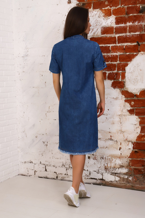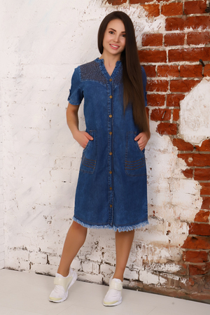 Платье джинсовое на пуговицах, с двумя накладными карманами, отстрочкой по груди. Длина изделия ниже колена, с бахромой по низу.