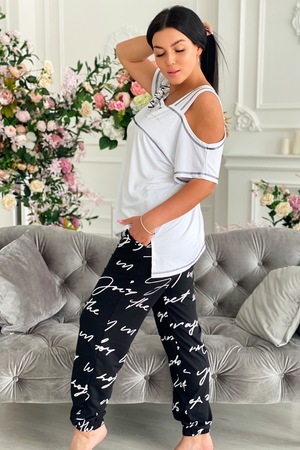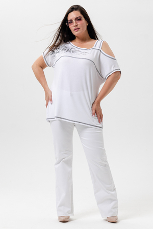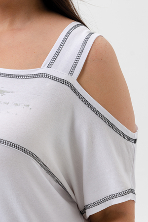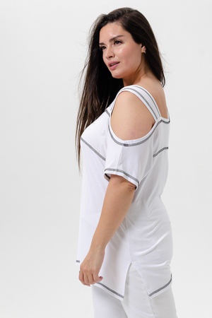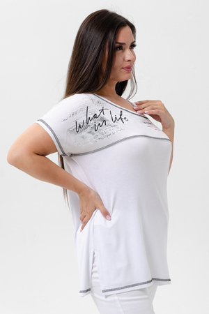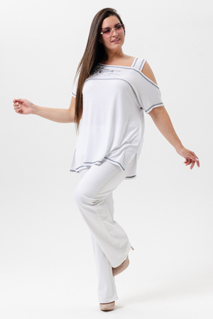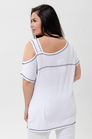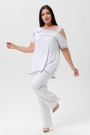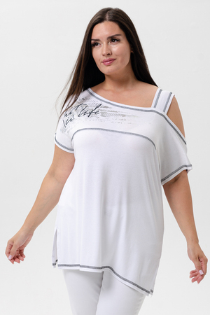 Туника женская полуприлегающего силуэта. Рукав цельнокроенный короткий, с одной стороны бретель на плече, в боковых швах разрезы. В верхней части полочки модный принт.
