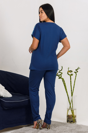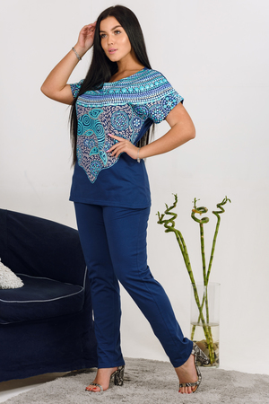Изделие выполнено из трикотажной хлопчатобумажной ткани. Кофта с удобным спущенным рукавом, который подчеркивает линию плеч, имеет прямой силуэт. Полочку украшает яркая печать, переходящая на рукав. Брюки свободного покроя. Имеются боковые карманы.