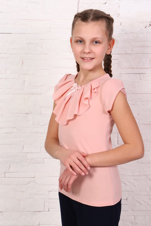Блузка для девочек младшего и старшего школьного возраста, из однотонного трикотажного полотна кулирка с лайкрой и шифона. Блузка полуприлегающего силуэта, с втачным рукавом из шифона, без застежки. Спереди и на спинке отсутствуют линии членения. Рукав короткий, из двух частей, присборенный по окату. Низ рукавов обметан на краеобметочной машине. Низ изделия подогнут. Срез горловины обработан узкой окантовочной лентой из того же полотна. Спереди жабо из шифона с декоративным элементом.
