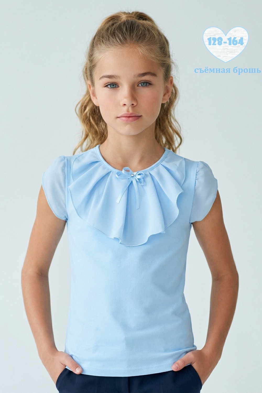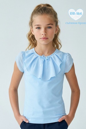 Блузка для девочек младшего и старшего школьного возраста, из однотонного трикотажного полотна кулирка с лайкрой и шифона. Блузка полуприлегающего силуэта, с втачным рукавом из шифона, без застежки. Спереди и на спинке отсутствуют линии членения. Рукав короткий, из двух частей, присборенный по окату. Низ рукавов обметан на краеобметочной машине. Низ изделия подогнут. Срез горловины обработан узкой окантовочной лентой из того же полотна. Спереди жабо из шифона с декоративным элементом.