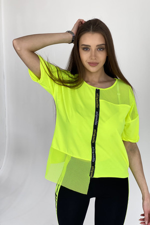 Футболка прямого силуэта, с округлой горловиной, с удлиненной спинкой. Рукав короткий, с загибом. На полочке расположены асимметричные кокетки из сетки. Горловина обработана бейкой из основного полотна.