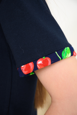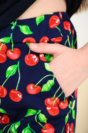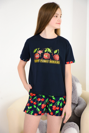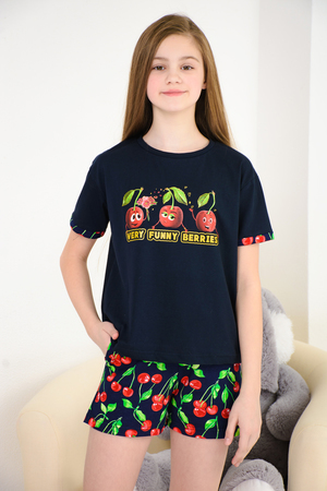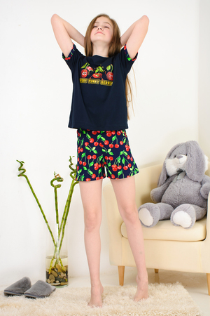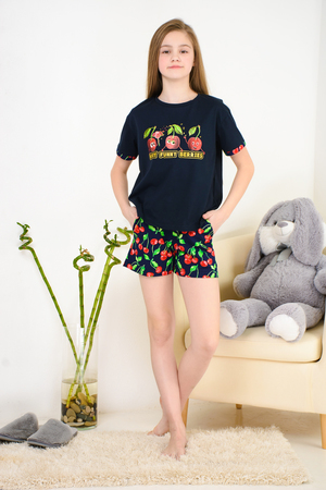"Весёлый" костюм для подростков состоит из футболки свободного кроя и шорт с боковыми карманами. Симпатичный принт - три вишенки. На рукавах манжеты с отворотами. Костюм незаменим на отдыхе и дома.