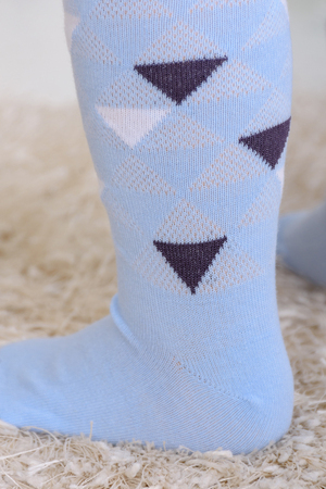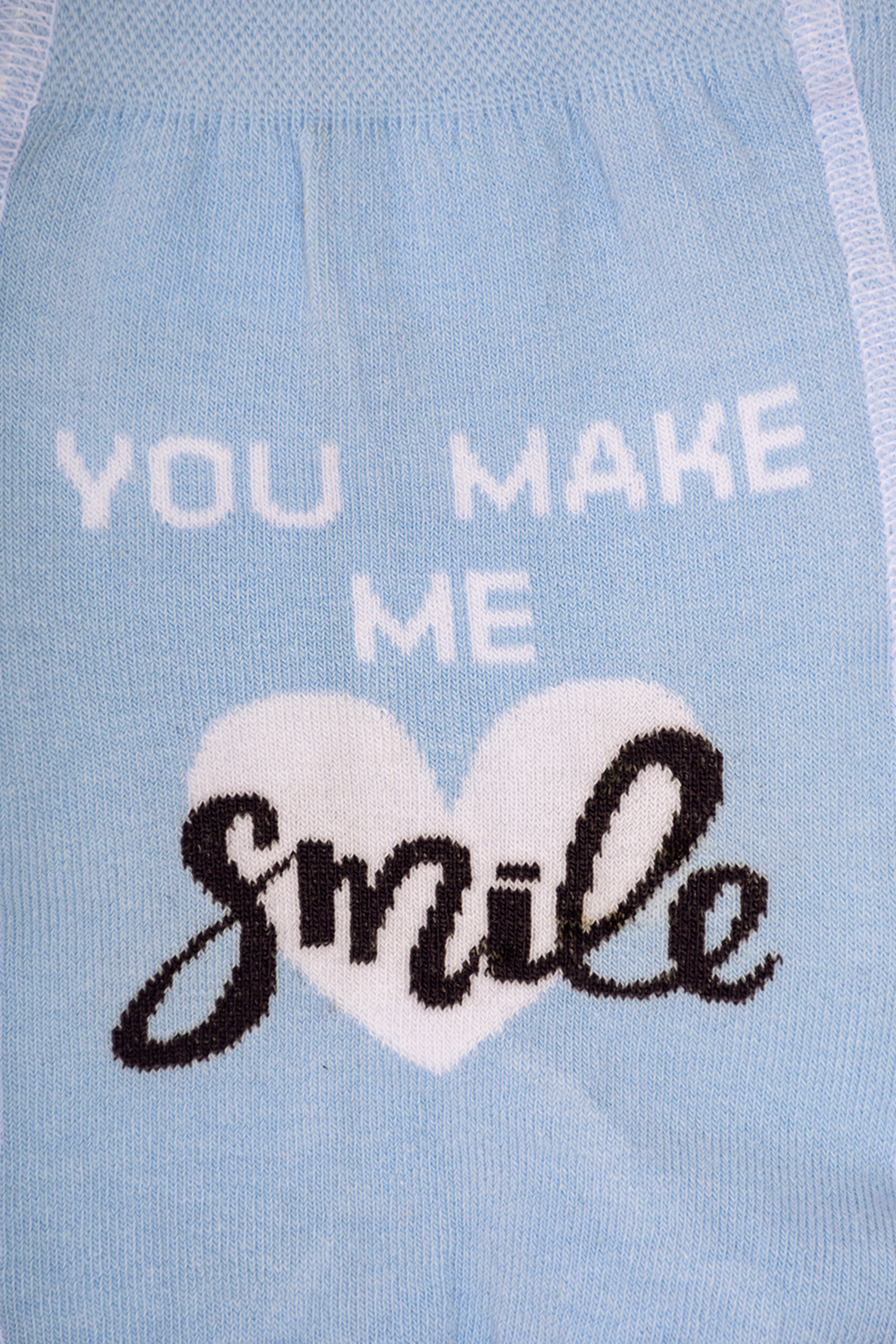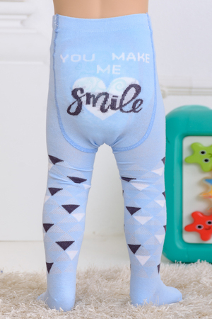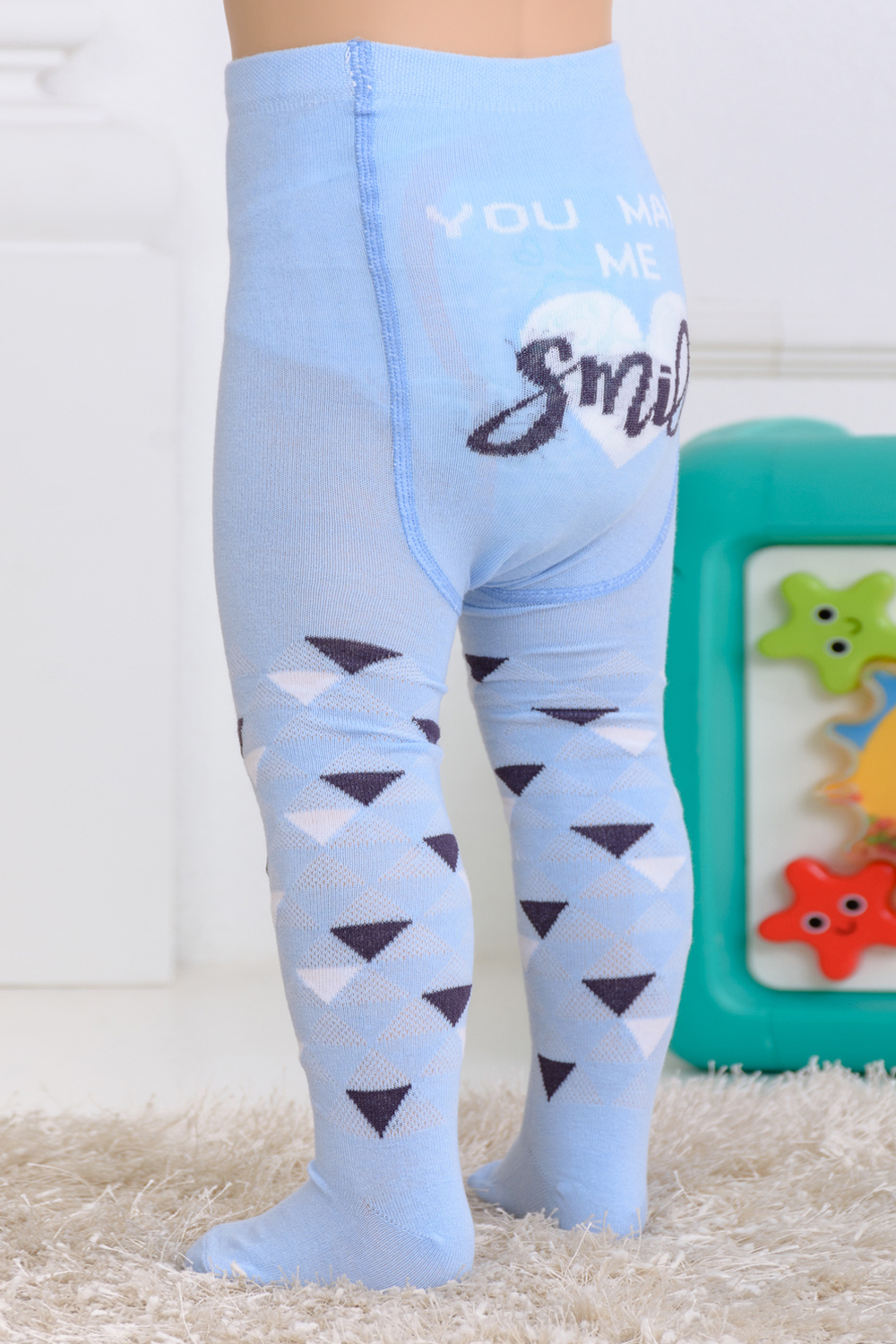 Колготки для самых маленьких. Приятные пастельные расцветки - розовая и голубая. По длине колготок вывязаны разноцветные треугольники, сзади надпись "You make me smile" ("Ты заставляешь меня улыбаться")