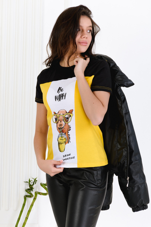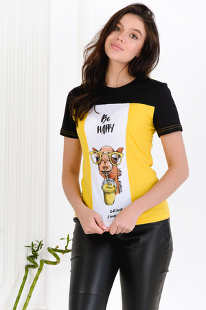 Стильная женская футболка. Основная ткань изделия 100% хлопок. На передней полочке принтованная вставка из ткани джерси (полиэстер), принт выполнен с использованием технологии сублимационной печати. Идеально подойдет для прогулок в теплую погоду.