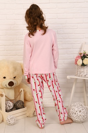 Пижама для девочек дошкольного, младшего и старшего школьного возраста, из набивного и однотонного трикотажных полотен кулирная гладь. Пижама состоит из свободных брюк и лонгслива. Лонгслив выполнен из однотонной кулирки, брюки и манжеты рукавов и брюк из набивного. Лонгслив прямого силуэта, с втачным рукавом. Спереди и на спинке отсутствуют линии членения. Рукав длинный одношовный, на манжете. Срез горловины окантован. Брюки прямые, на манжетах. Верхний срез брюк подогнут с резинкой 7мм. По низу брюк манжеты. На переднюю часть лонгслива нанесен печатный рисунок.