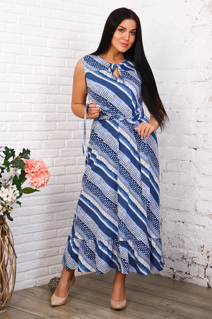 Женский летний сарафан длины макси. Без рукава, по низу широкая оборка, с поясом на талии. Горловина округлой формы, имеет завязки