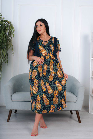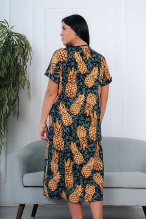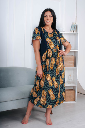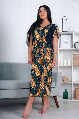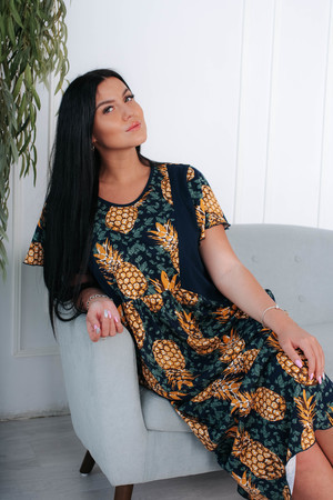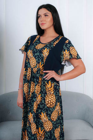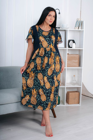 Платье женское свободного кроя. На полочке по бокам имеются рельефы из однотонной отделочной ткани, вырез круглый, рукав короткий, в средней части полочки имеется сборка, низ обработан краевкой. Очень легкое платье и приятное в носке. Платье темно-синего с изображением ананасов.