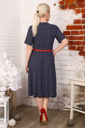 Платье с отрезной юбкой на складках с карманами, на карманах красная отделка, V-образный вырез, короткие рукава, на полочке передней декоративные красные пуговицы. Летнее, удобное и приятное к телу платье. Пояс в комплекте