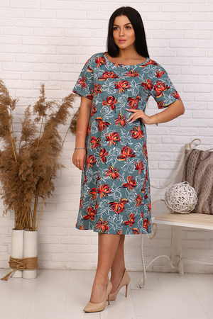 Платье женское расширенного силуэта с коротким рукавом. Горловина изделия округлой формы обработана стойкой. Низ изделия и рукавов подогнут.