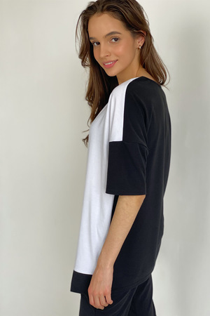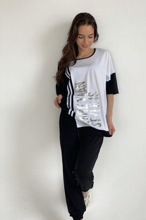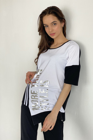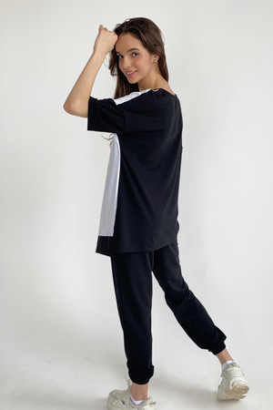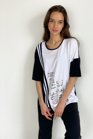 Футболка прямая, свободная, с округлой горловиной, с асимметричным низом. Рукав короткий. Центральная часть полочки выполнена из отделочного полотна. Вдоль шва соединения частей полочки расположены лампасы из отделочного полотна. Горловина обработана бейкой из основного полотна.
