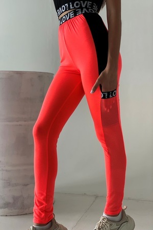 Лосины облегающие, длинные, сверху на декоративной резинке. Вдоль боковых швов расположен лампас из отделочного полотна и сетки. В средней части лампаса обработан карман.