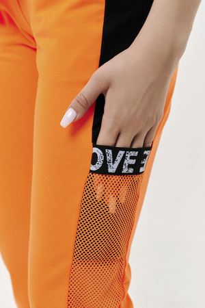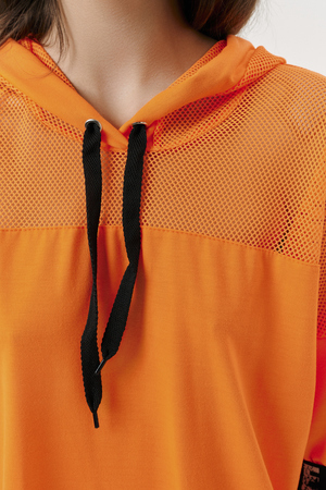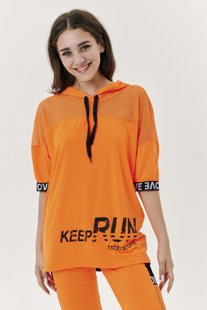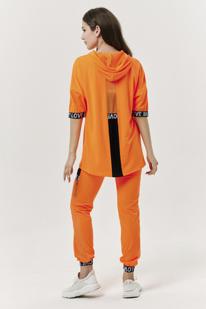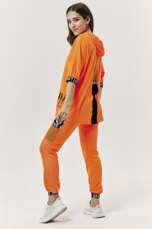 Костюм состоит из туники и брюк. Туника прямая, свободная, с капюшоном из сетки, с удлиненной спинкой. Рукав короткий, обработанный декоративной резинкой. Кокетка полочки выполнена из сетки. Вдоль центра спинки расположена декоративная вставка из отделочного полотна и сетки. Брюки свободные, длинные, с карманами, на эластичном поясе. Низ брюк обработан декоративной резинкой. Вдоль боковых швов расположен лампас из отделочного полотна и сетки. В средней части лампаса расположен карман.