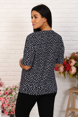Туника женская силуэта "летучая мышь". Вырез горловины "лодочка", рукав короткий с манжетой. Рисунок - белый горошек на черном фоне придаст образу женственность и очарование.