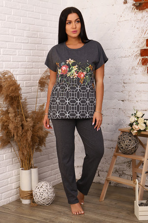 Костюм выполненн из легкой ткани меланж. Кофта имеет слегка расклешенный крой, длина средняя. Печать на изделии удачно сочетает яркие цветы и геометрические фигуры. Брюки прямые, с карманами.
