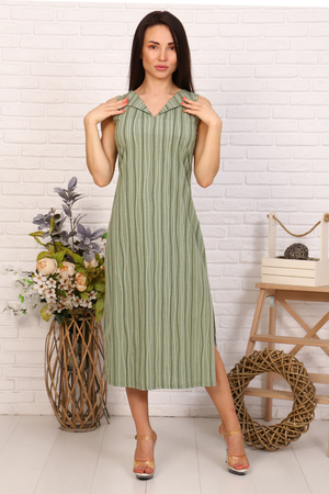 Сарафан приталенного силуэта с V-образным вырезом горловины и отложным лацканом. Без рукавов, ниже колена.