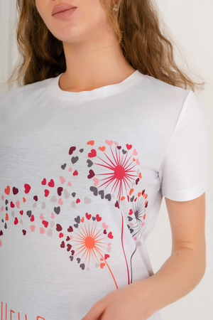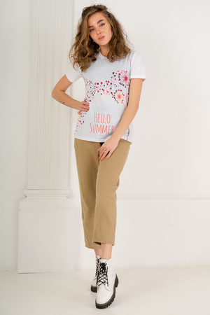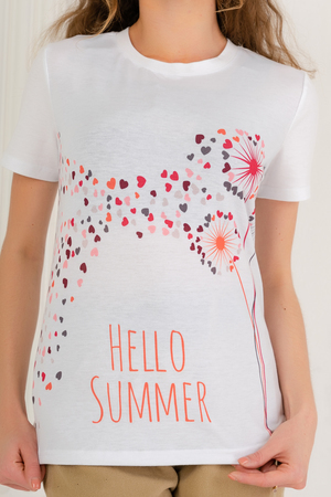 Стильная женская футболка. Основная ткань изделия 100% хлопок. На передней полочке принтованная вставка из ткани джерси (полиэстер), принт выполнен с использованием технологии сублимационной печати. Идеально подойдет для прогулок в теплую погоду.