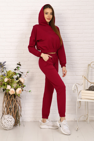 Костюм женский состоит из брюк и укороченной толстовки с длинным рукавом и капюшоном