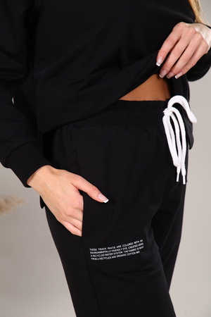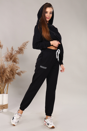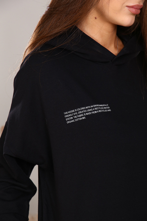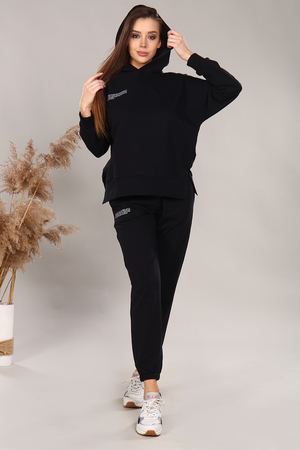 Костюм женский с капюшоном. Худи свободного кроя, без кармана, по бокам разрез. Рукав на манжете со спущенным плечом. Брюки прямые с боковым карманом, с внутренним шнурком, низ на резинке. На худи и брюках имеется небольшая печать с правой стороны.