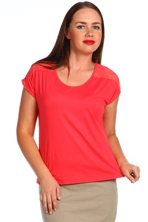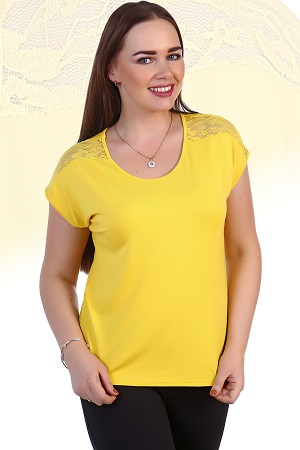 Блузка женская из вискозы. Кружевные вставки, короткие рукава, четыре расцветки — желтая, коралловая, ментоловая и фуксия. Размеры от 46 до 56.
