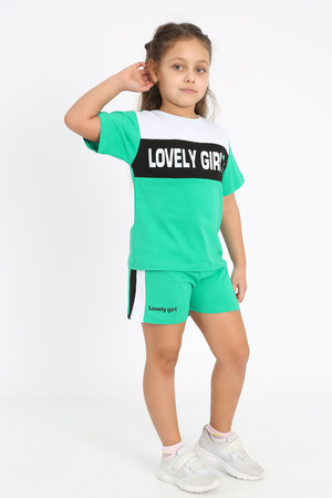 Костюм для девочек из хлопковой ткани кулирки, состоит из футболки и шорт. Футболка свободного кроя, рукав втачной с заниженной проймой, на полочке два горизонтальных подреза, по горловине узкая бейка из рибаны, спереди на вставке печать. Шорты прямые свободные, по бокам две вставки разного цвета, по талии резинка отделочная, длина выше колена.