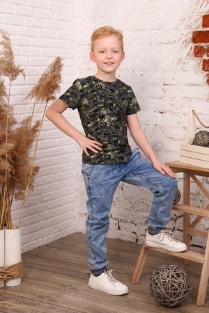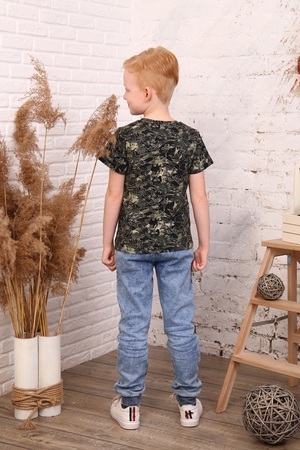 Футболка для мальчиков младшего и старшего школьного возраста из трикотажного полотна кулирка с лайкрой с рисунком. Футболка прямого силуэта, с втачным рукавом. Спереди и на спинке отсутствуют линии членения. Рукав одношовный, короткий. Низа рукава и изделия подогнуты. Горловина с обтачкой из того же полотна. По шву втачивания обтачки в горловину проложена отделочная строчка.