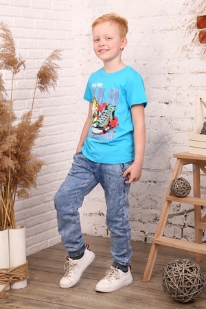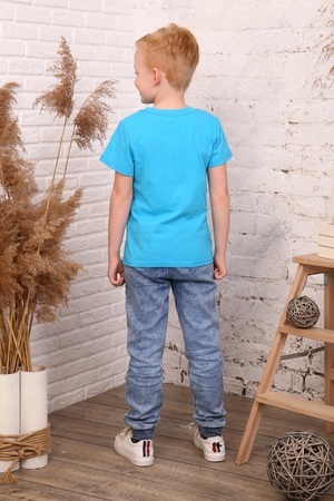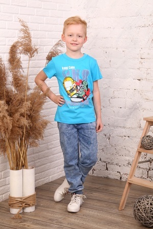 Футболка для мальчиков дошкольного, младшего и старшего школьного возраста из однотонного трикотажного полотна кулирная гладь. Футболка прямого силуэта, с втачным рукавом. Спереди и на спинке отсутствуют линии членения. Рукав одношовный, короткий. Низа рукава и изделия подогнуты. Горловина с обтачкой из рибаны. По шву втачивания обтачки в горловину проложена отделочная строчка. На передней части нанесен печатный рисунок.