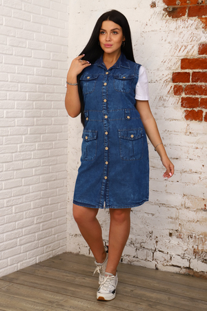 Платье джинсовое на пуговицах с четырьмя накладными карманами. Без рукавов, с рубашечным воротником. Средней длины.