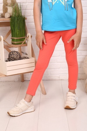 Лосины для девочек дошкольного и младшего школьного возраста, из трикотажного полотна – однотонная кулирка с лайкрой. В верхний срез лосин втачена резинка. Низ и верх лосин подогнуты.