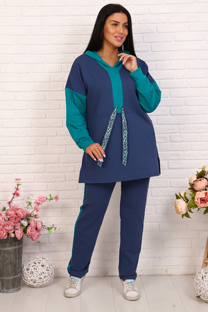 Костюм женский с капюшоном из плотного трикотажного полотна, кофта со спущенной проймой, рукав на манжете, карманы листочки, по бокам разрезы.