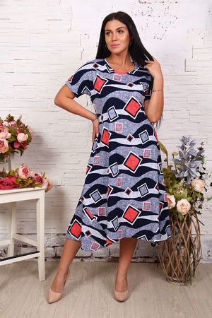 Платье женское с цельнокроенным коротким рукавом. Расклешенный силуэт. Низ изделия со вставками и оформлен в форме декоративных углов.