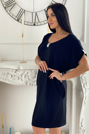 Платье женское прямого силуэта. Рукав цельнокроенный короткий. Середина горловины полочки и низ рукава слегка собран на декоративную серебряную тесьму. От линии талии по центру полочки встречная складка. В боковых швах изделия есть карманы.