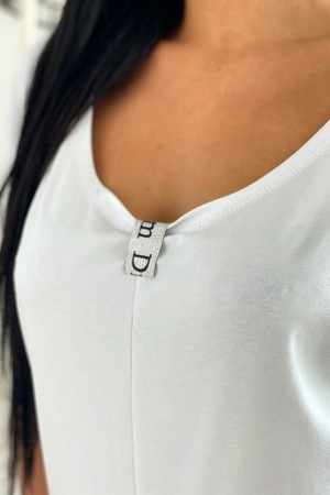 Платье женское прямого силуэта. Рукав цельнокроенный короткий. Середина горловины полочки и низ рукава слегка собран на декоративную серебряную тесьму. От линии талии по центру полочки встречная складка. В боковых швах изделия есть карманы.